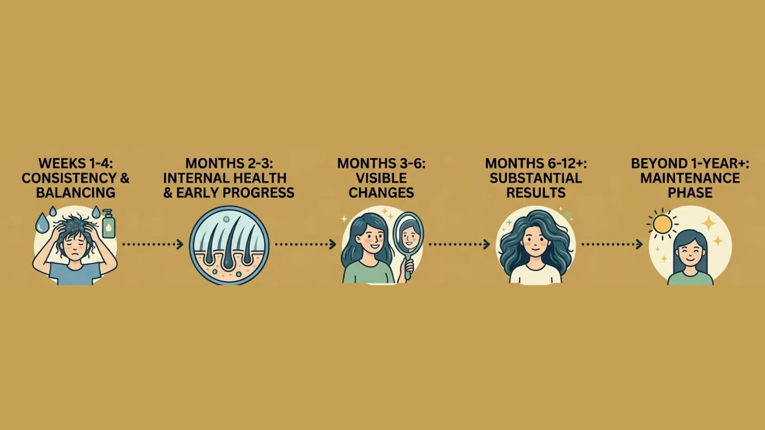 • Results from a scalp treatment for hair growth take time, with early improvements in scalp condition and longer timelines for visible changes in hair density.