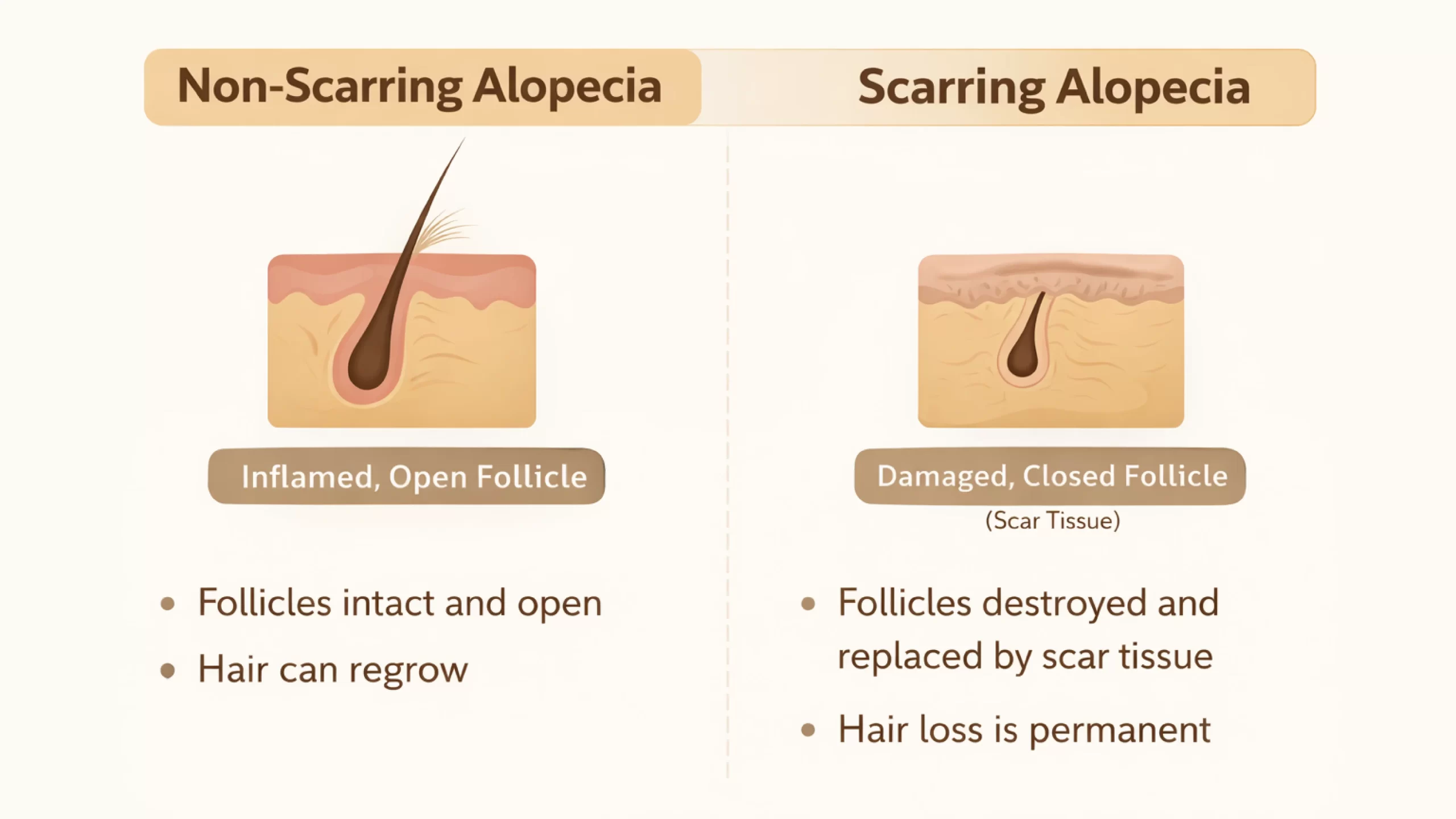 Alopecia is often grouped into scarring and non-scarring types. This distinction helps explain whether hair can grow back.