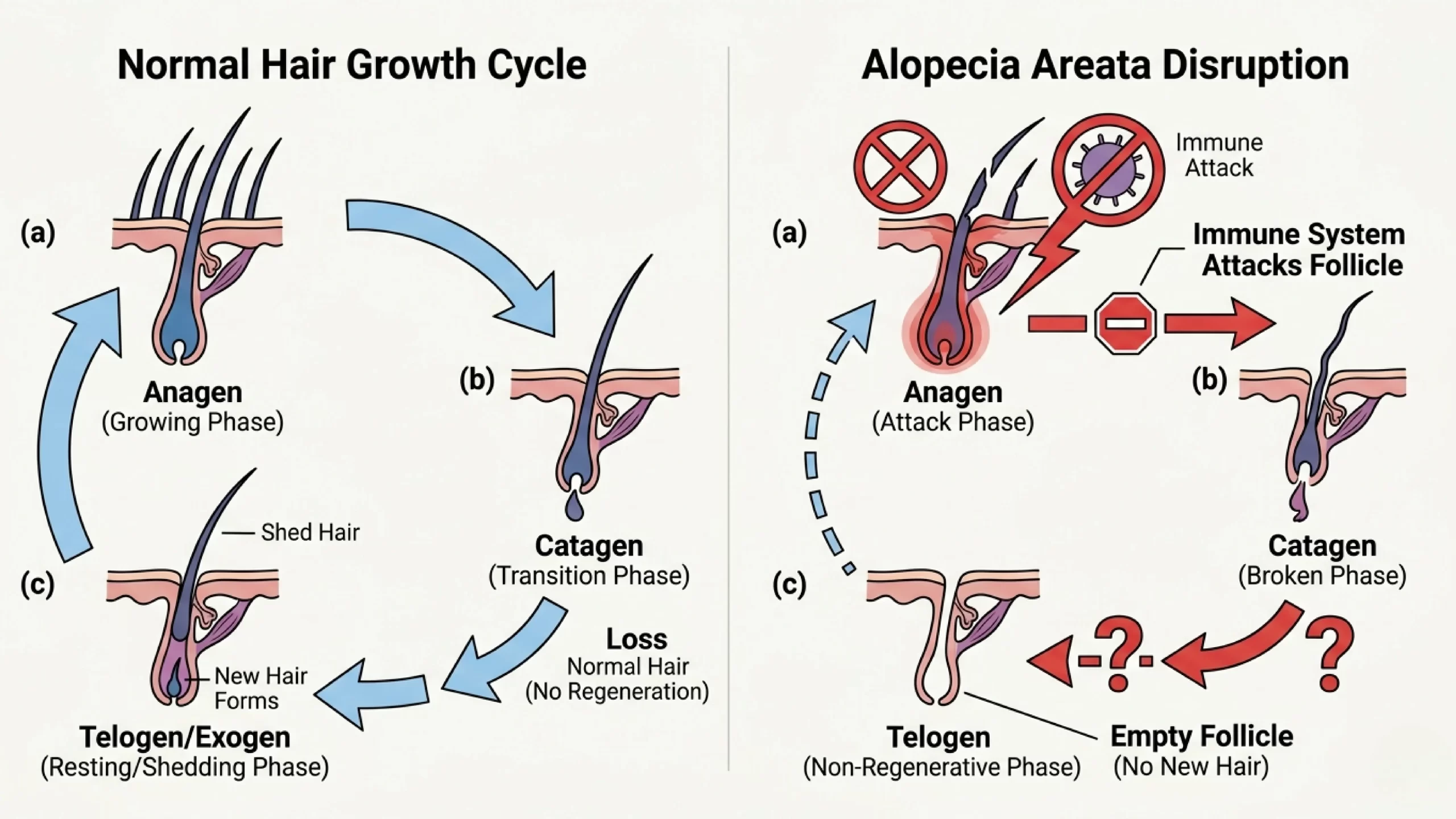 In autoimmune types like alopecia areata, the immune system targets hair follicles during the growth phase. This interrupts normal hair production and can lead to sudden hair loss. These changes can also trigger sensations like itching or tingling in some individuals.